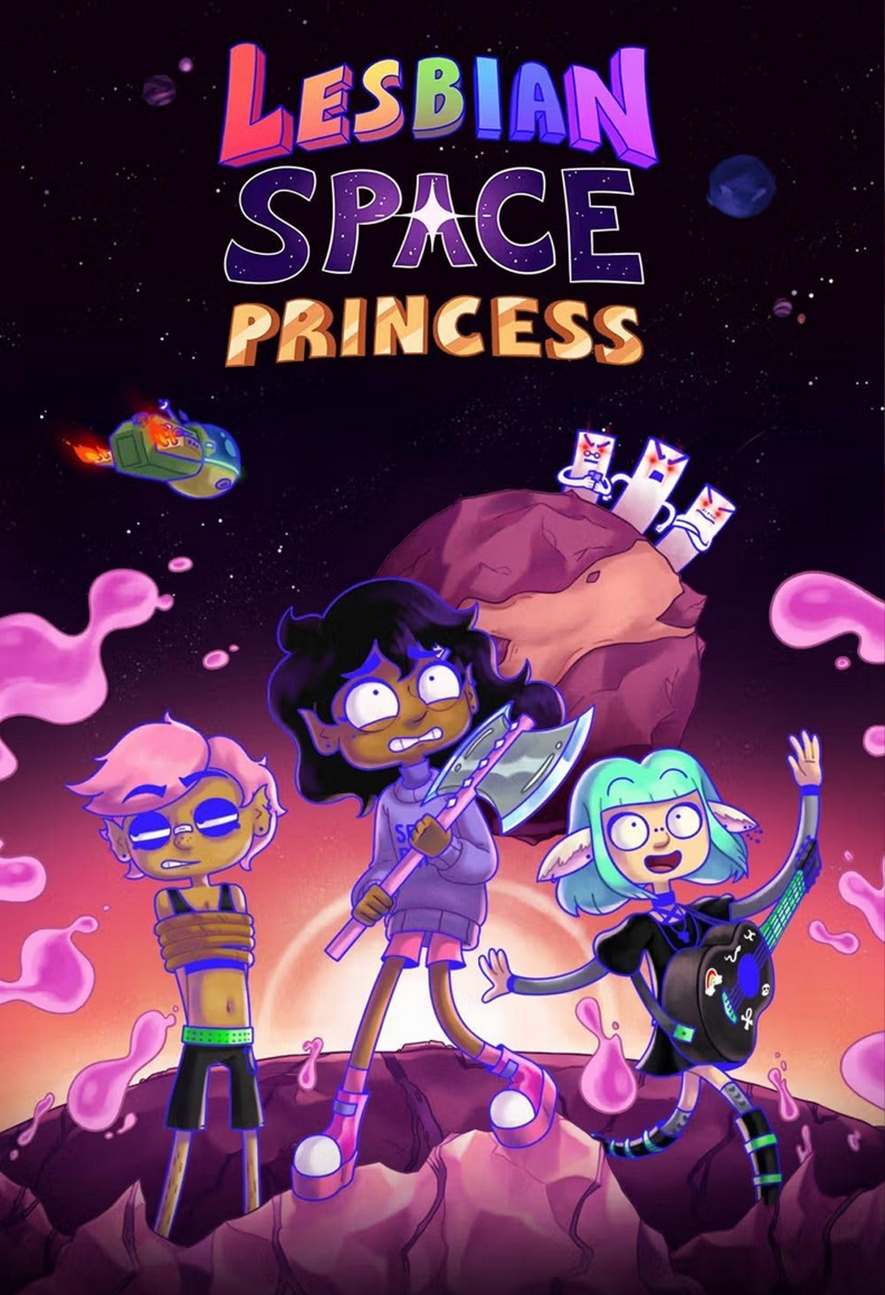 A space princess is thrust out of her sheltered life and into a galactic quest to save her bounty hunter ex-girlfriend from the Straight White Maliens.