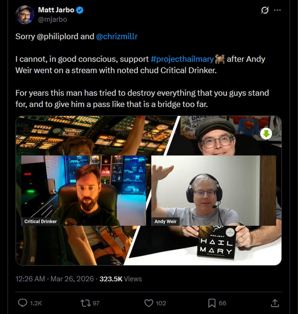 Firstly, Weir appeared on the Drinker’s podcast and had a good chat. I haven’t seen/heard it yet, but it’s on my list. Although some people weren’t happy that the creator of Project Hail Mary appeared on the show.
