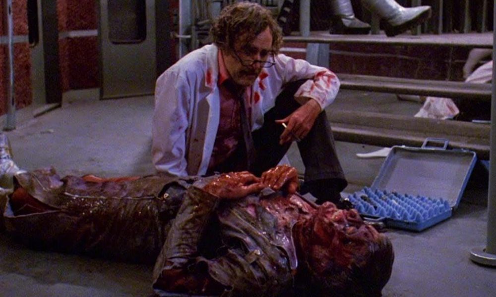 Everyone leaves the lab and janitor Michael Bowen enters to clean up. Bowen is a half-brother of the Carradines and has a surprisingly jacked credit list. He has been in everything from Night of the Comet to The Godfather Part III to Kill Bill and more.