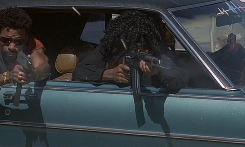 They go out for donuts because they’re cops and thwart a drive-by shooting to work up an appetite. Mario dives through the air firing twin Berettas. Denison runs after the perps, leaping from vehicle to vehicle like a coked-up Lord Humungus Marauder. For a finale, he jumps on the back of a motorcycle and steers the criminal into a brick wall at full speed. Fireball blooms. Denison walks out of the wreckage with a smoking jacket and a smile.