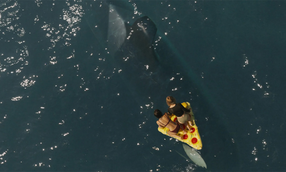 The reef/cove is about 3 feet deep; this fact pops up again later. While jet skiing around the reef, there’s an ‘accident’ and Josh dies. The two of them are left on an inflated ‘pizza slice’ and try to make it to a rock. For some reason, the killer whale cannot see them on the inflatable.