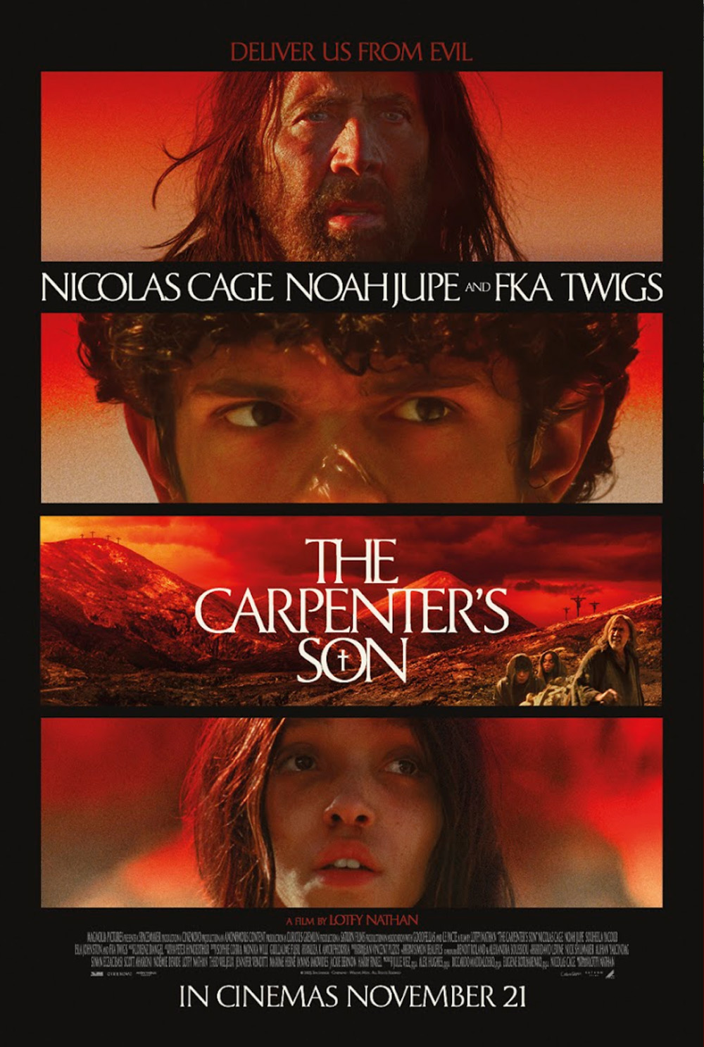 The Carpenter’s Son stars Nick Cage, Noah Jupe, FKA Twigs, Isla Johnston, Souheila Yacoub, and Elena Topalidou. Lofty Nathan is the writer and director. If you think you know the name FKA Twigs, she was the appropriately named wooden plank from The Crow remake.