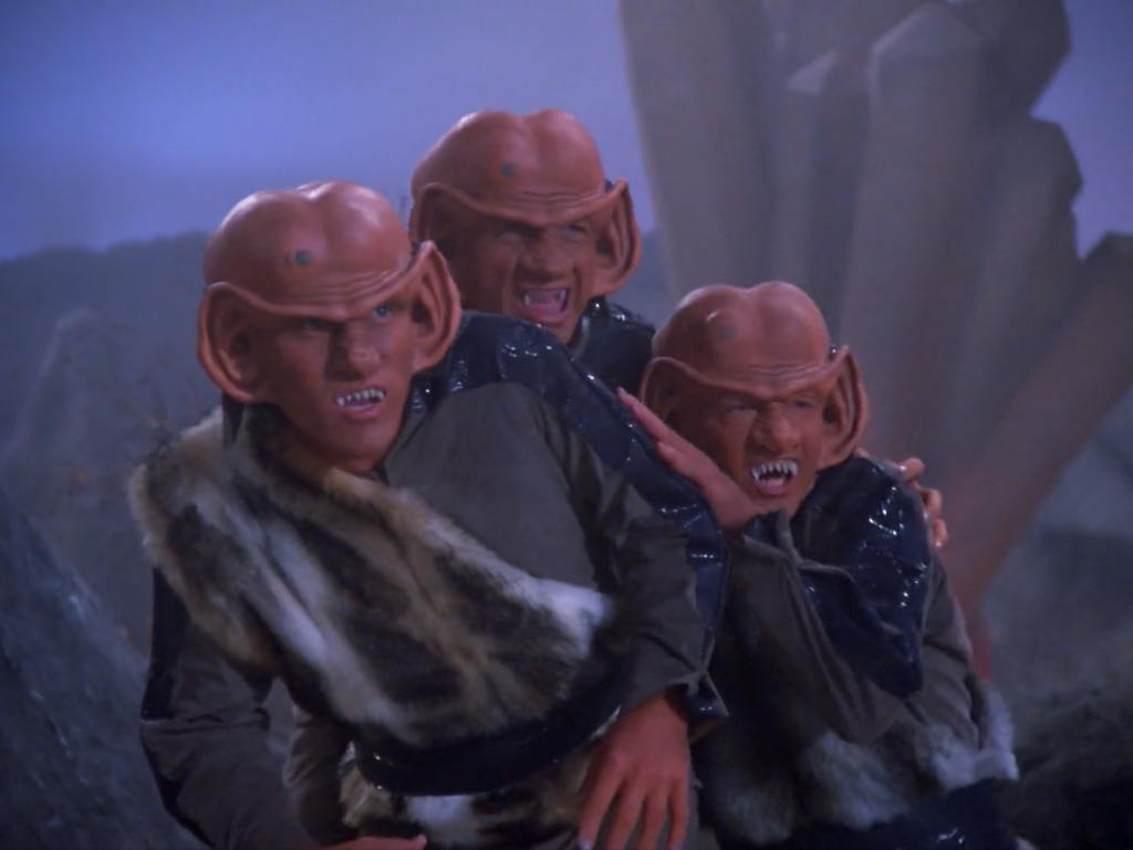 The Firengi! We see them for the first time and that’s pretty much how they are throughout the rest of the most of the series run. They would stop bouncing around like wild lemurs and only hiss and snarl in certain situations going forward. They’d also lose the stupid whips and furs and begin dressing somewhat more flamboyantly as you’d expect a profit minded race to be.