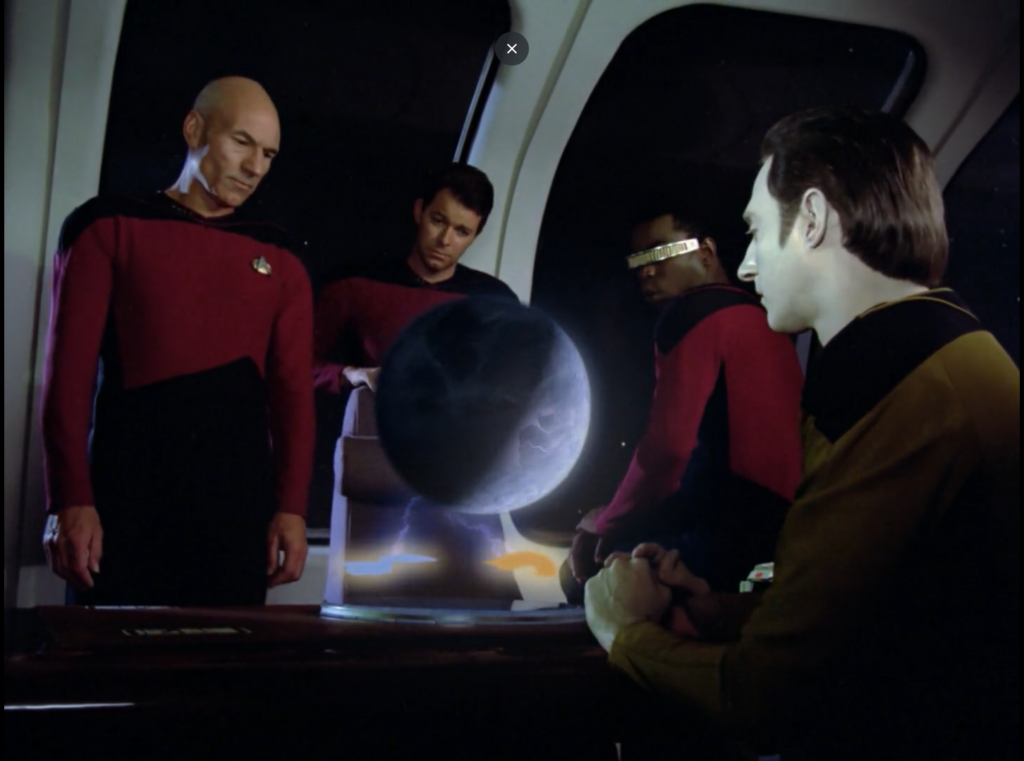 Riker has to stand up to the portal and answer his questions. His knowledge of Sun Tzu is intriguing to the portal. He also shows a lot of mercy to the Firengi. As time goes on, he won’t be as nice to them.