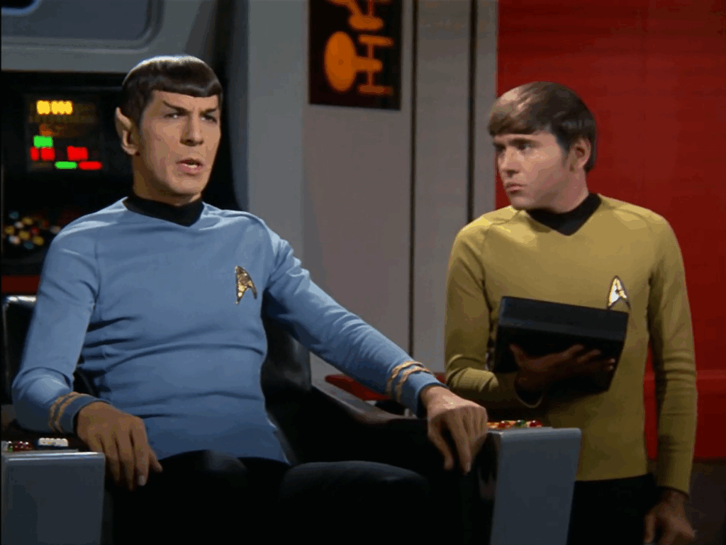 Spock does his best to deal with the bureaucrat’s runaround but finally says the vulcan equivalent of “fuck this” and goes down to the planet himself.