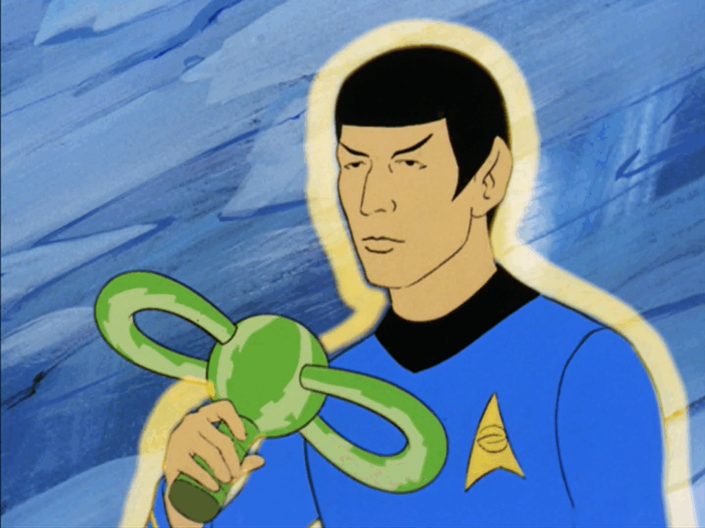 The Kzinti have an empty Slaver box, which is the only way to find another stasis box. They manage to open the Enterprise crew’s box and find old meat, a strange hologram statue, and…a mysterious gun-like device. The item can shift its form. Spock and Sulu manage to escape but are recaptured when they trigger a matter-destruct sequence.