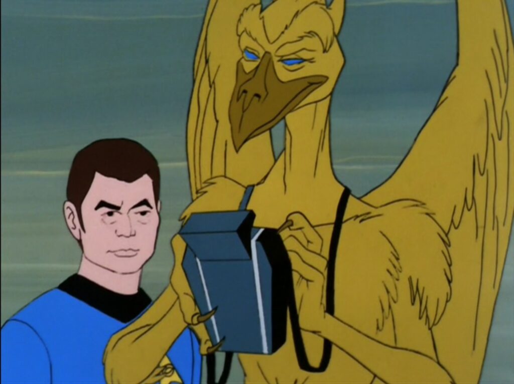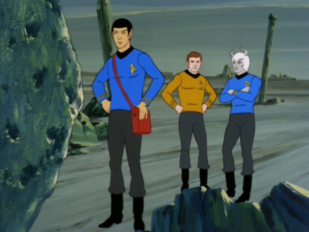 While Arex and M’Ress sit this one out, we do a have new first officer, Thelin. He is the first officer since Spock is now a paradox. Interestingly he’s gray skinned rather than blue. At the time you’d chalk it up to an animation coloring error or some other limitation of the medium. In the original script, he was supposed to light blue.