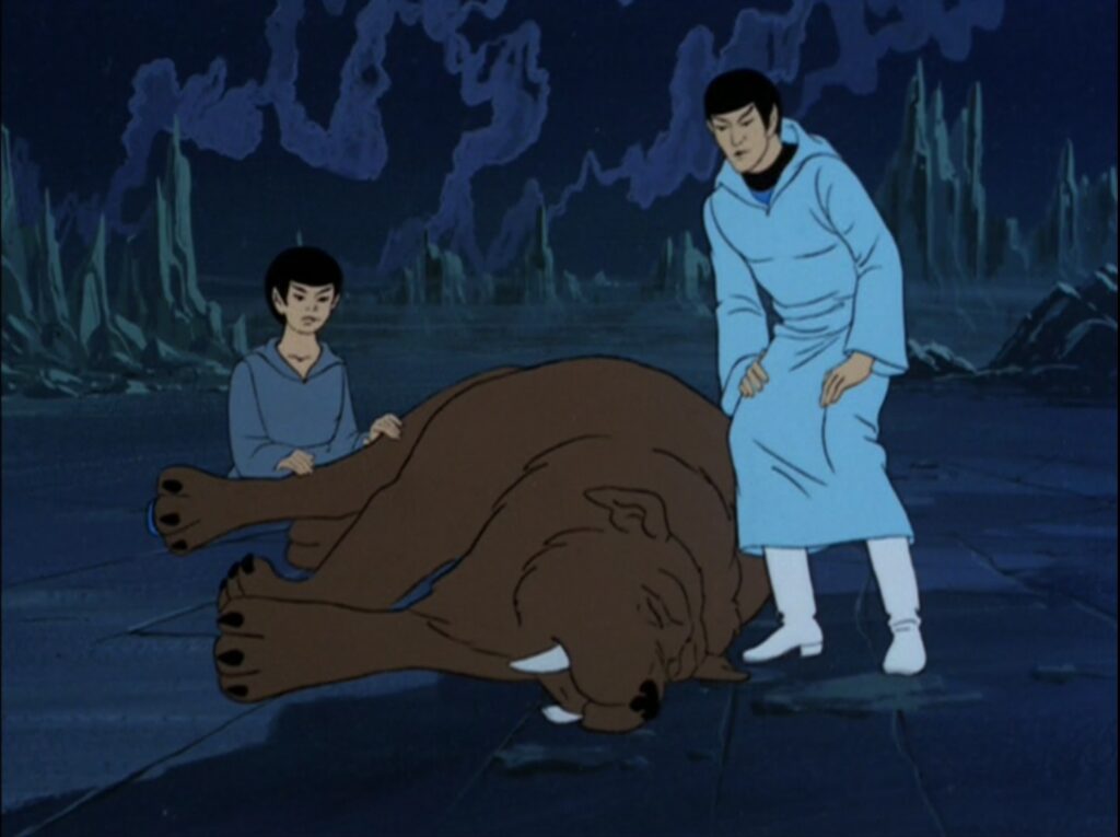 This episode can probably more than any other in TAS be considered canon. Spock being bullied by other Vulcans, the Forge and the city ShiKahr would be referenced in Enterprise. His “teddy bear” Ichaya is seen here. The beast that attacks apparently is a distant relative of Godzilla, as they have the exact same roar.